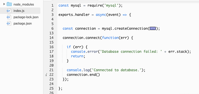 단순하게 예제 몇개보고 그냥 mysql 모듈설치후, 람다에 올려서 테스트를 해보려고했는데
