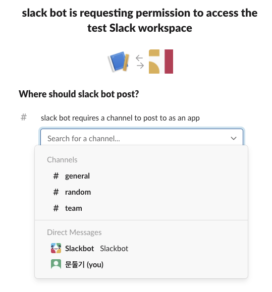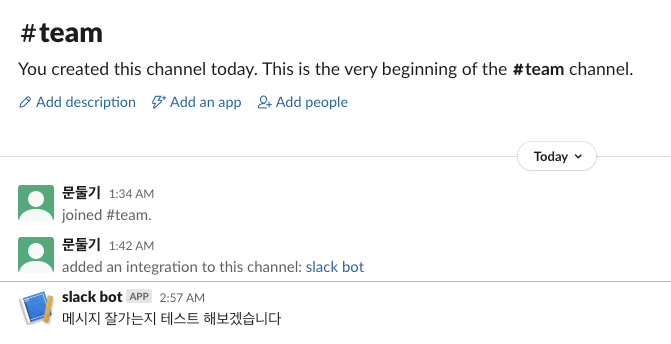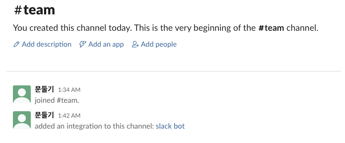 여기까지 잘됐으면 해당 슬랙채널에 방금만든 slack bot 이 들어오게됩니다