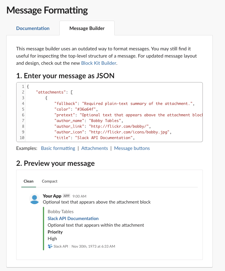 This message builder uses an outdated way to format messages. You may still find it useful for inspecting the top-level structure of a message. For updated message layout and design, check out the new Block Kit Builder. 2. Preview your message We found an