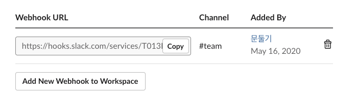 변경하면 이렇게 webhook URL 목록이 생깁니다.