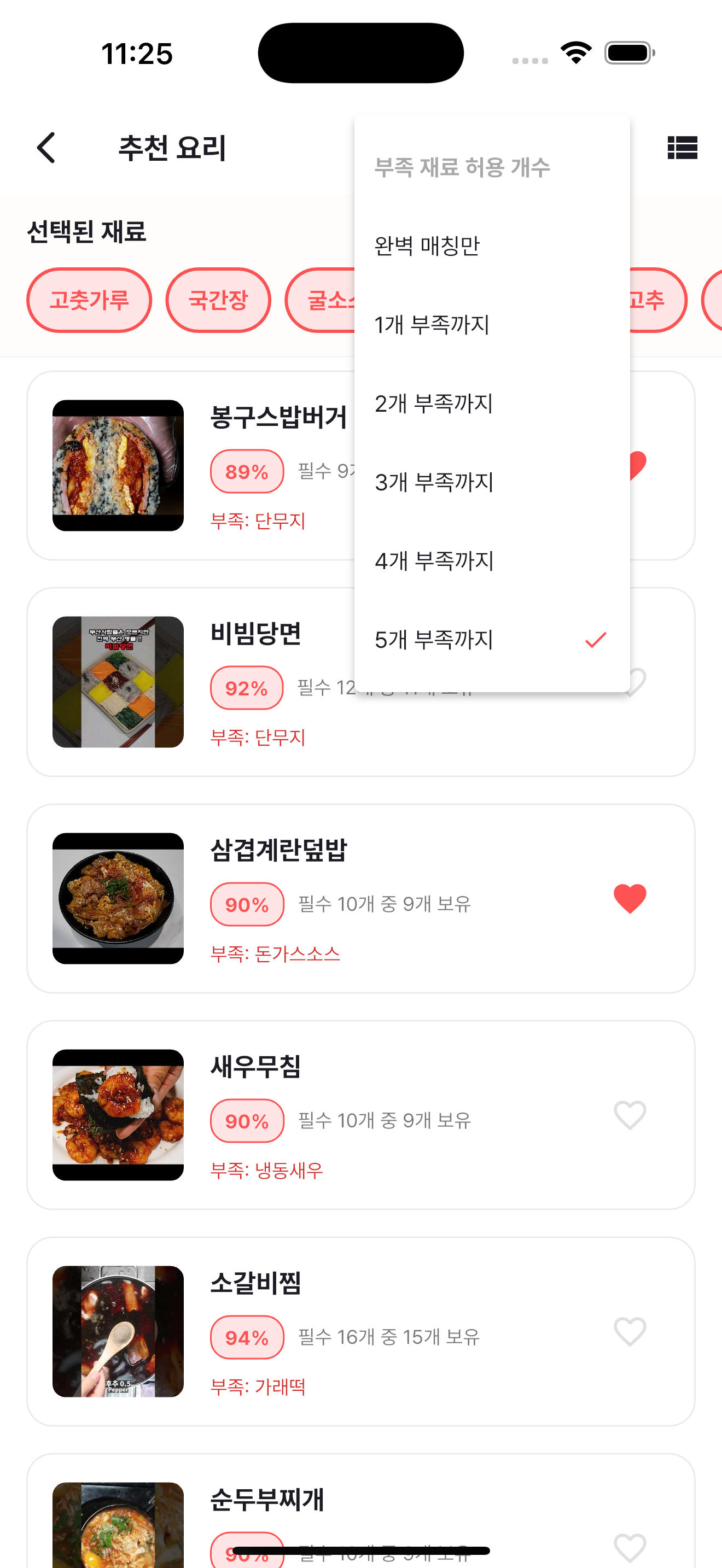 그리고 재료가 조금 모자라도 레시피를 보고싶어할수도있으니 "부족한 재료 허용개수" 옵션도 추가했다.