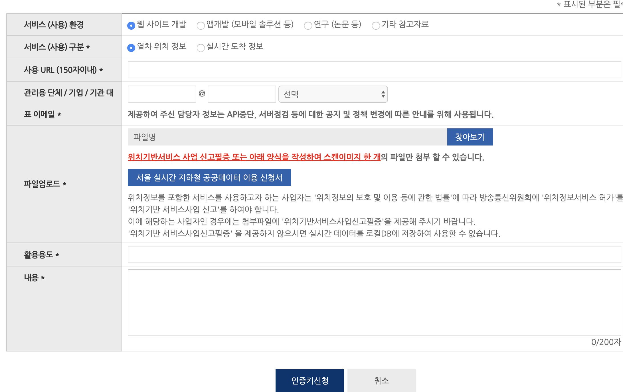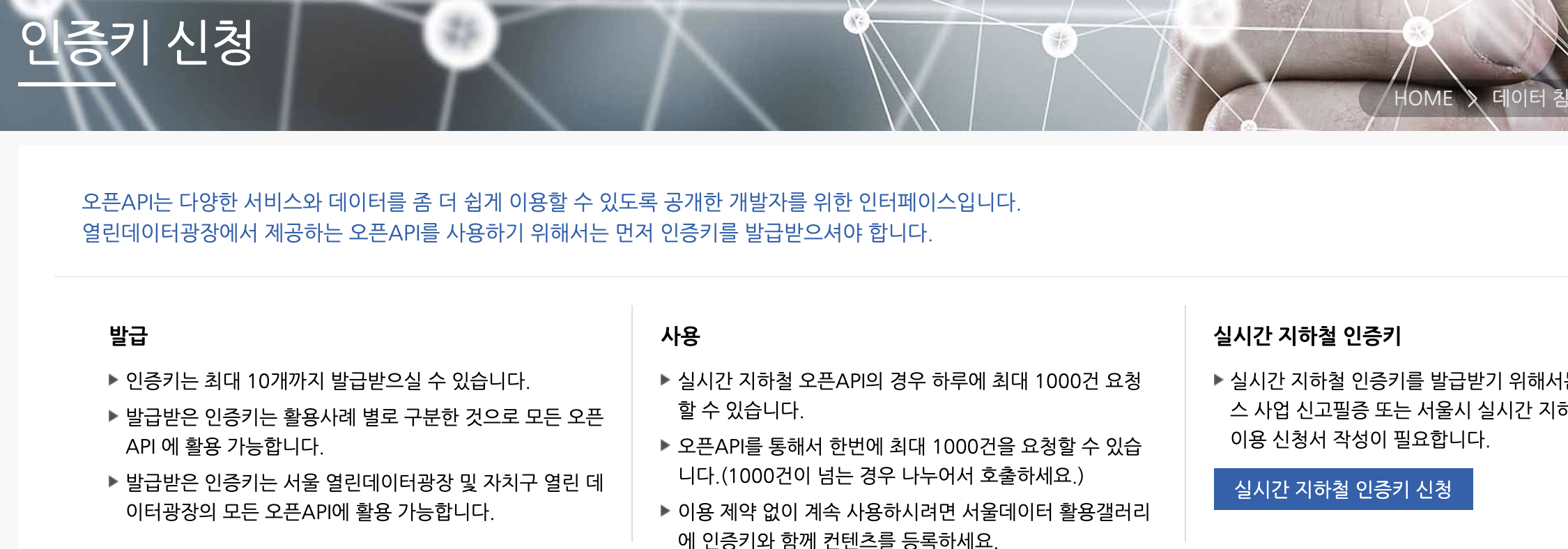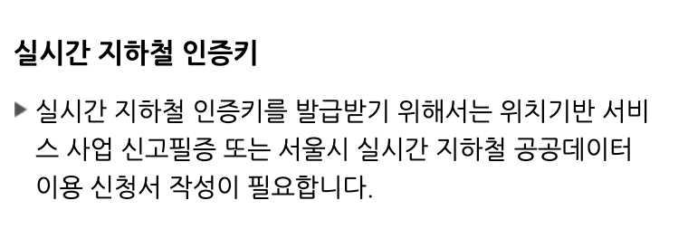 일반 인증키로는 안되기때문에 삽질하지말고 실시간 지하철 인증키 신청하자..